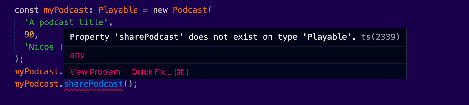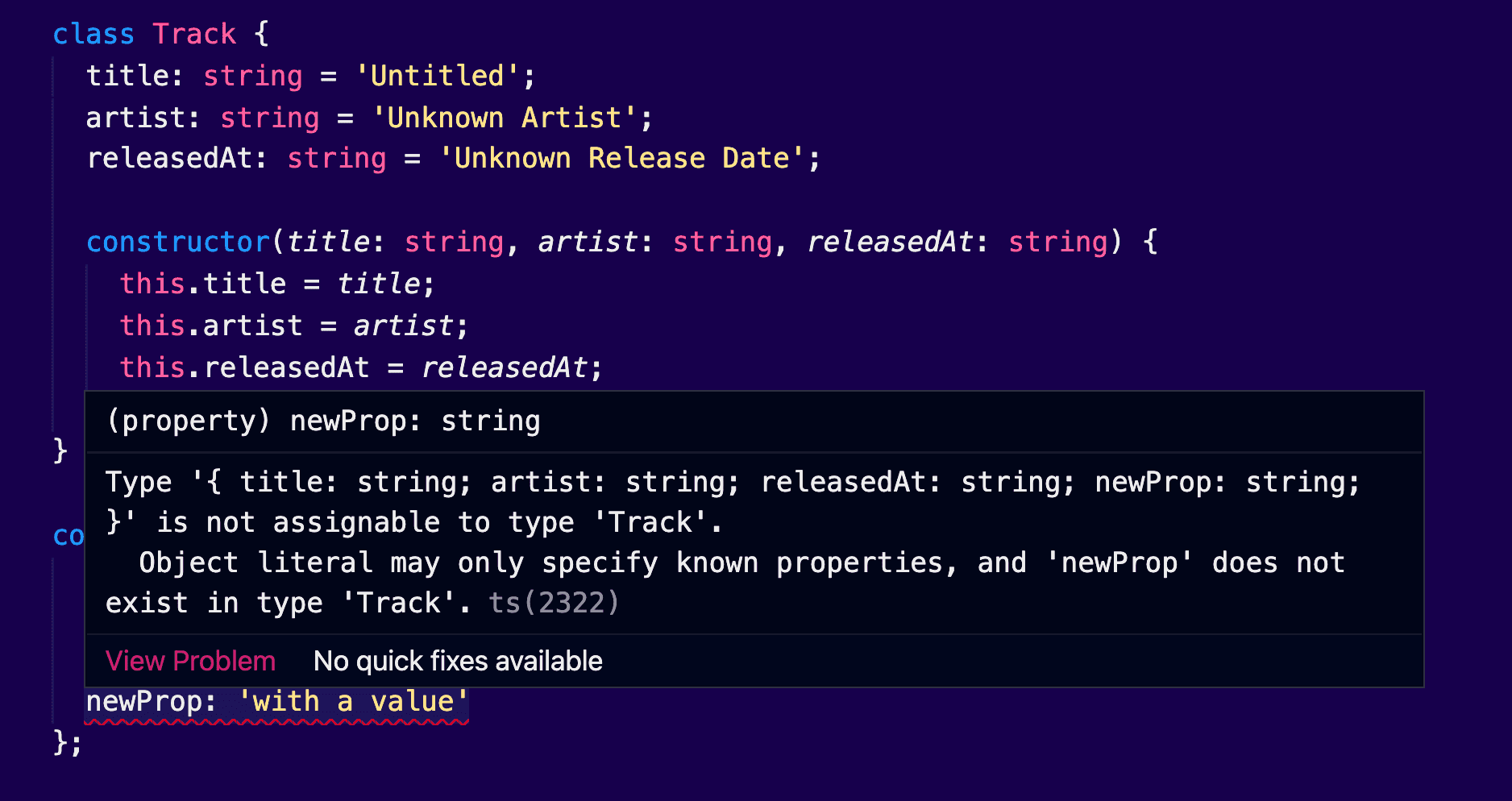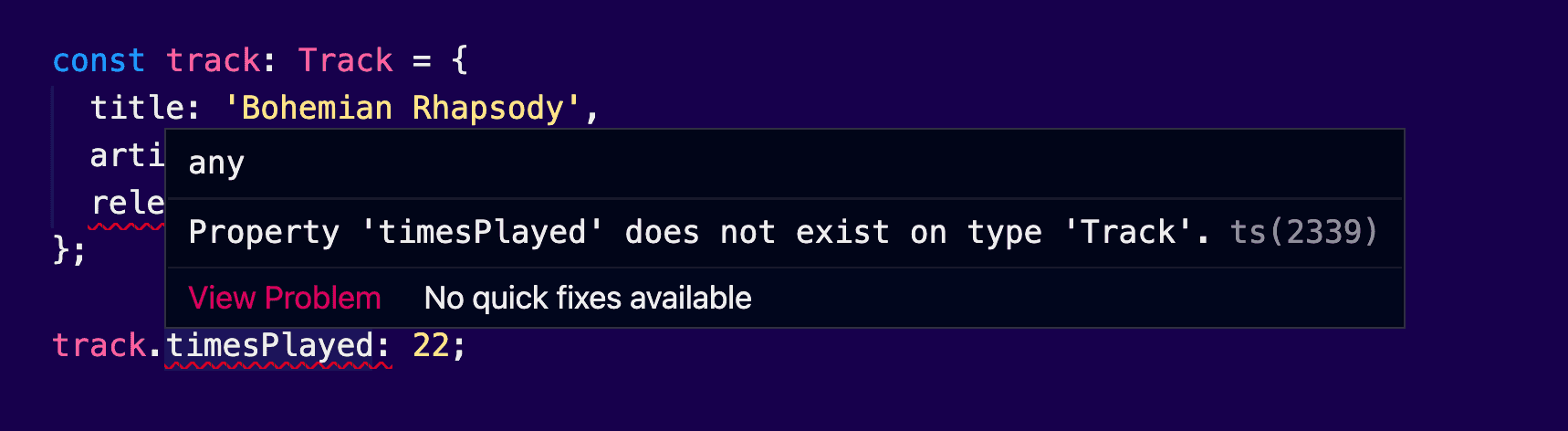 track.timesPlayed: 22; // Property 'timesPlayed' does not exist on type 'Track'And here’s the error I will get when I try to set a value to a property that doesn’t exist: