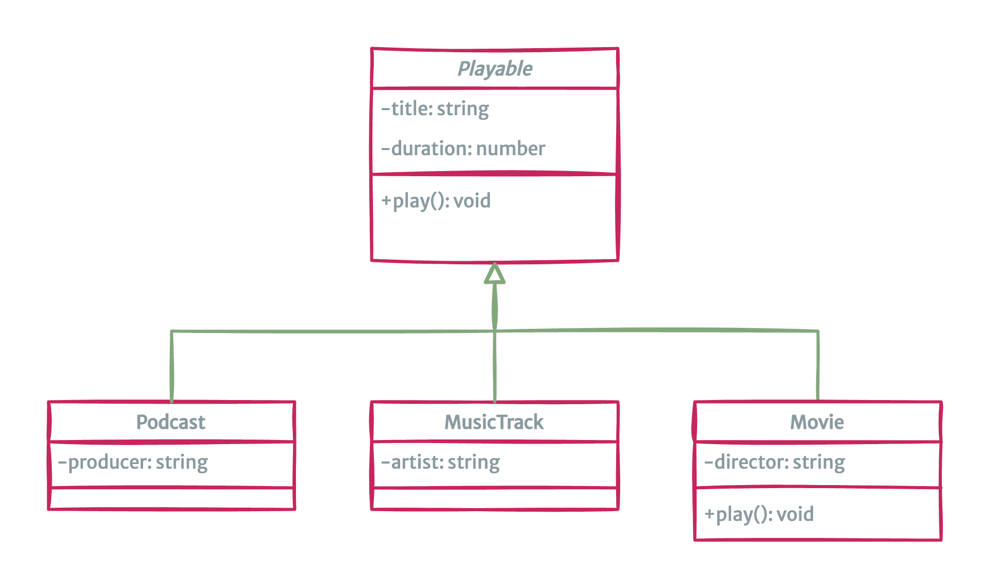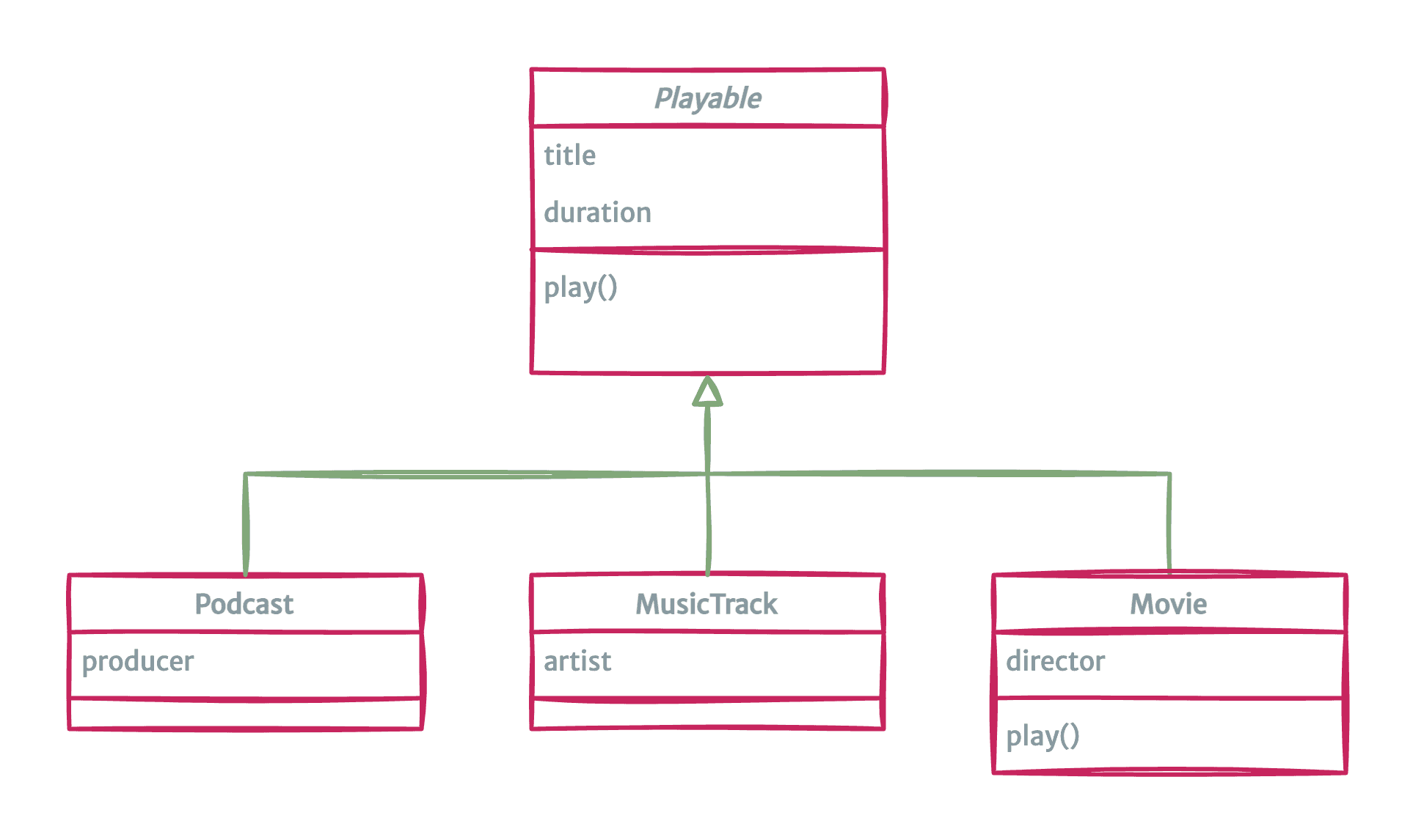 playable.sharePodcast()And here’s where the magic begins. We can use the type of the abstract class Playable to indicate that our variable can host any object from classes that derive from Playable: