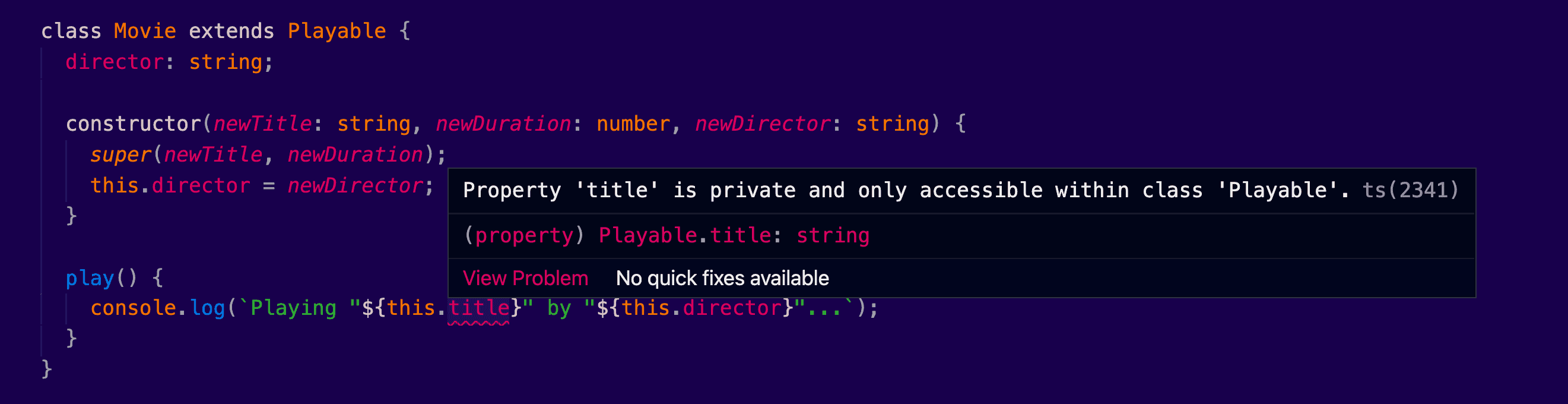 myMovie.title = 'broken title' // Error: Property title is private and only accessible within class PlayableThat’s very convenient and secure. As a side effect, we can’t even access or change this property from within the derived classes. You will notice that now our Movie class, has a very interesting error:
