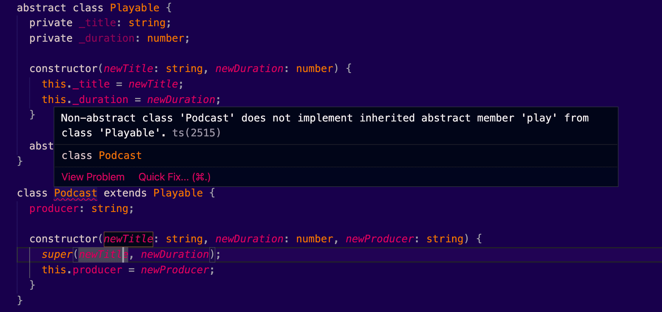 }In the previous example, we extend the class Playable, to create a Podcast class. Note that if we fail to implement all its methods, we will get a very informative compilation error: