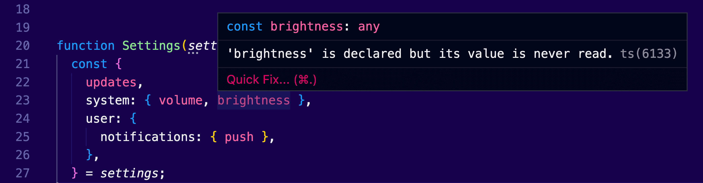 This initialization could become extremely useful when we are consuming values multiple times within the scope of a function or a method. It’s better if you have to type push instead of the complete path settings.user.notifications.push.