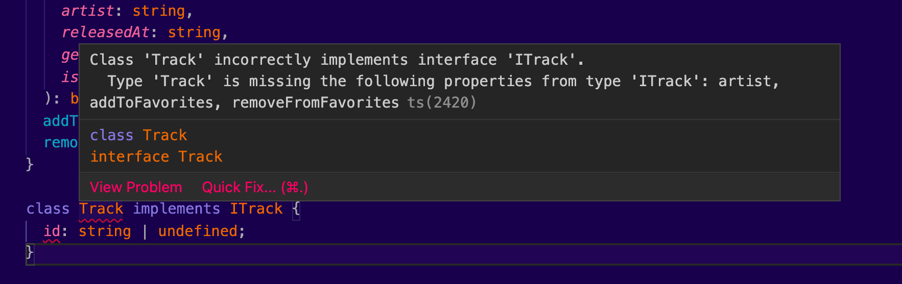 }The interface Track, defines the expected shape of these objects. That includes properties and their associated types. The properties releasedAt and genres are optional. No big surprises here compared to what we know about other types, right?