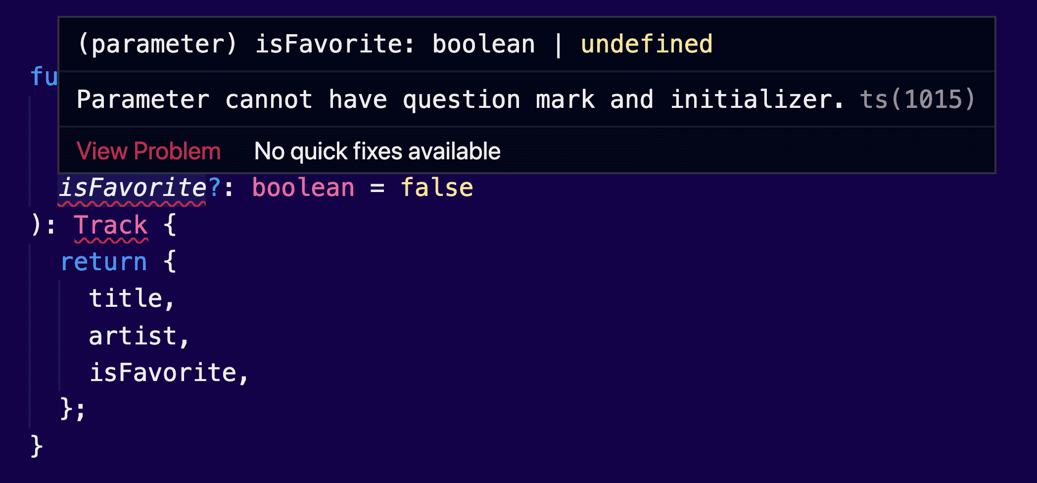 }Here, we let TypeScript know that the isFavorite argument is optional. Every time we are calling this function we have the option to skip it.