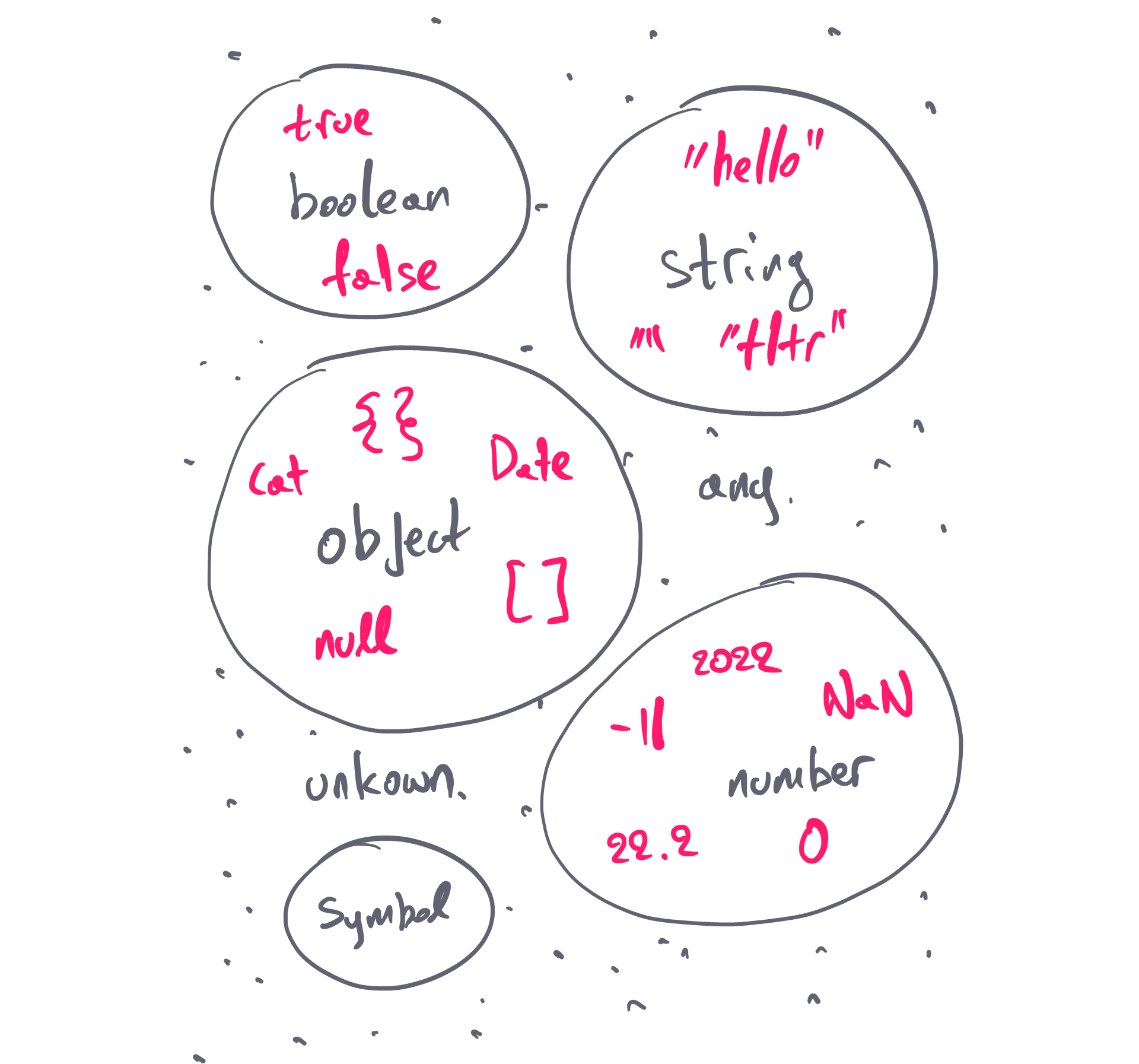Now, let’s zoom in, to see which values are compatible for each of them. Note that a number type can also include NaN. An object type can include any object declaration {}, arrays, regular expressions, dates, and the list goes on: