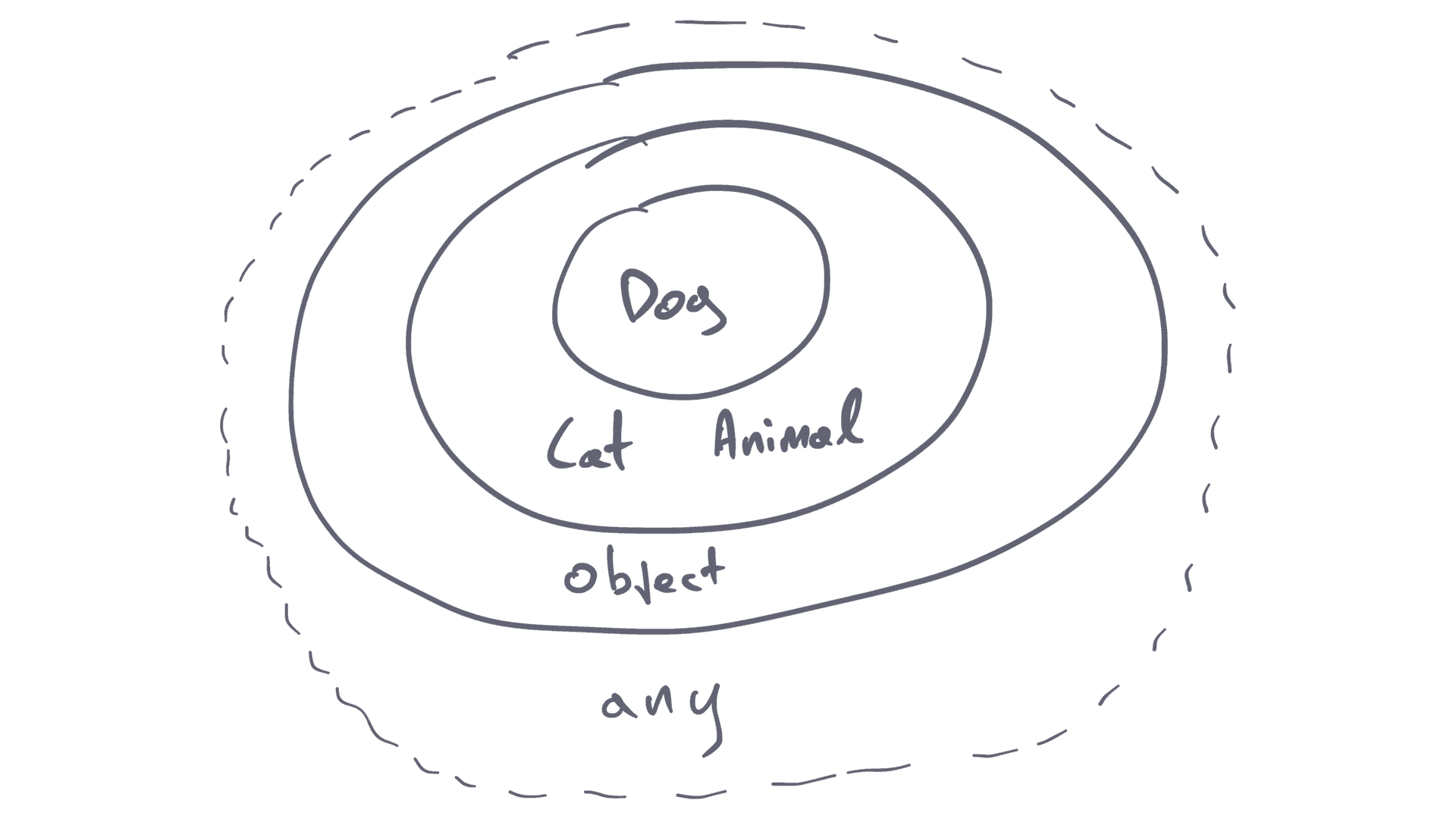 The Dog type can be assigned to both the Cat and the Animal types. That logically doesn’t make sense, because the Animal is the logical parent of these two types. That’s the tricky part you need to understand with TypeScript. The same applies with the object type, which can accept any object structure. At the very top we have any, which can accept all the types.