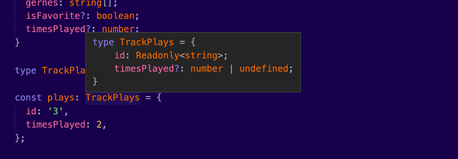 }Here’s how we can easily use the Pick<T, K extends keyof T> utility type to define a new TrackPlays type alias: